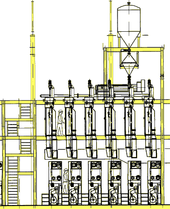 flexibility in design Because of the parallel spinning process the design of the POY or FDY spinning plants gives to the yarn producer a high flexibility. The take-up arrangement for POY and FDY is "exchangeable". The difference of producing FDY yarn is that for the drawing of the yarn godets are required.As the yarn falls straight down from the interfloor duct to the winder, which is arranged in a parallel way to the yarn path, it is possible either to spin POY or FDY yarn on the same plant configuration. For POY spinning the yarn producer simply switches off the godets and the yarn is led directly by skipping the godets to the winder.